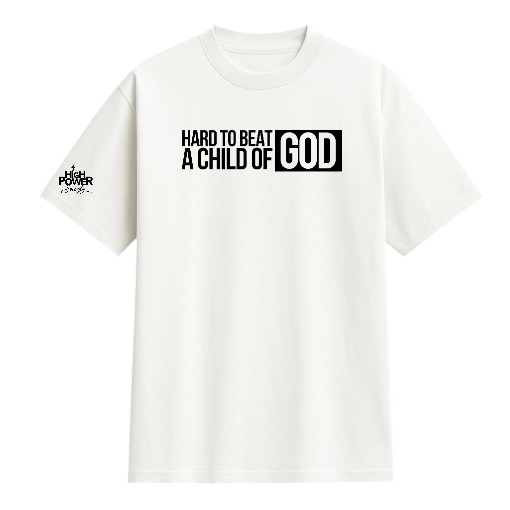 Featuring the “Hard to Be a Child of God” statement across the front and a subtle High Power Society logo on the right sleeve, this tee balances bold messaging with clean, intentional design.